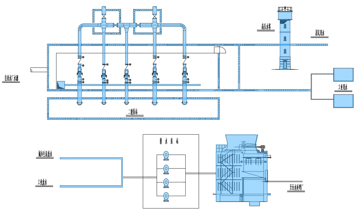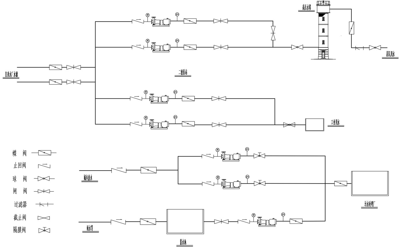 供水系統(tǒng):保證城市工況企業(yè)及居民生活用水輸配,將經(jīng)過(guò)給水處理后的水送到各個(gè)給水區(qū)域的全部管網(wǎng),同一泵站內(nèi)的不同水泵分別供水到水壓要求高的高壓管網(wǎng)和水壓要求低的低壓管網(wǎng)。